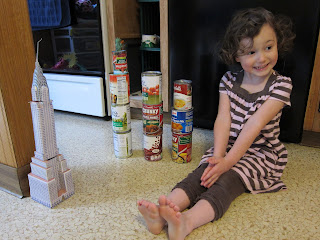 Just after I mentioned in my last post that Kate is quite a fan of the Chrysler Building in New York City, she spent the afternoon in the kitchen building a replica of Manhattan out of canned goods. But of course, no tin can NYC would be complete without her model of the Chrysler Building. How many three year olds do you know with their very own Chrysler Building? Just one, I bet!